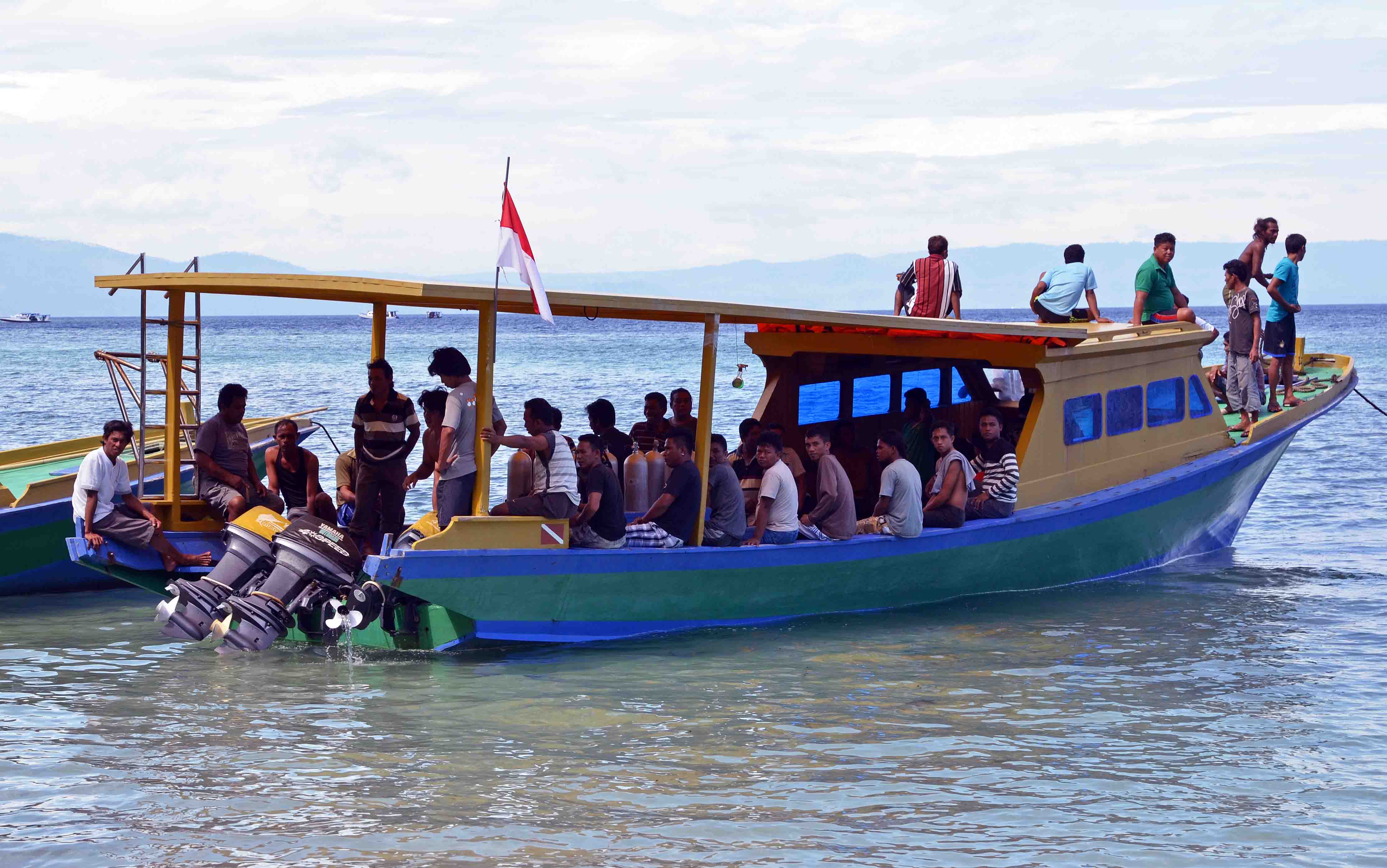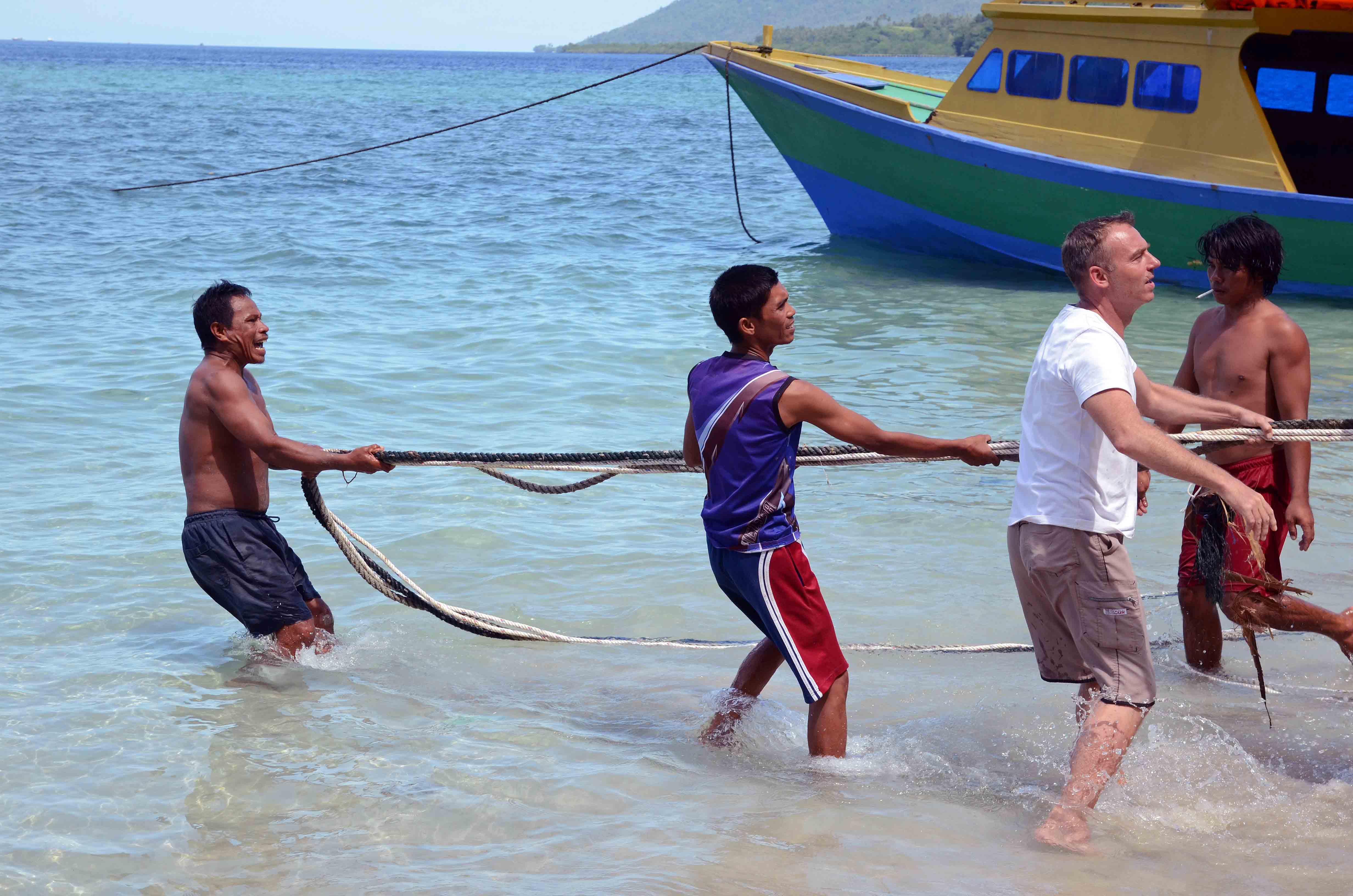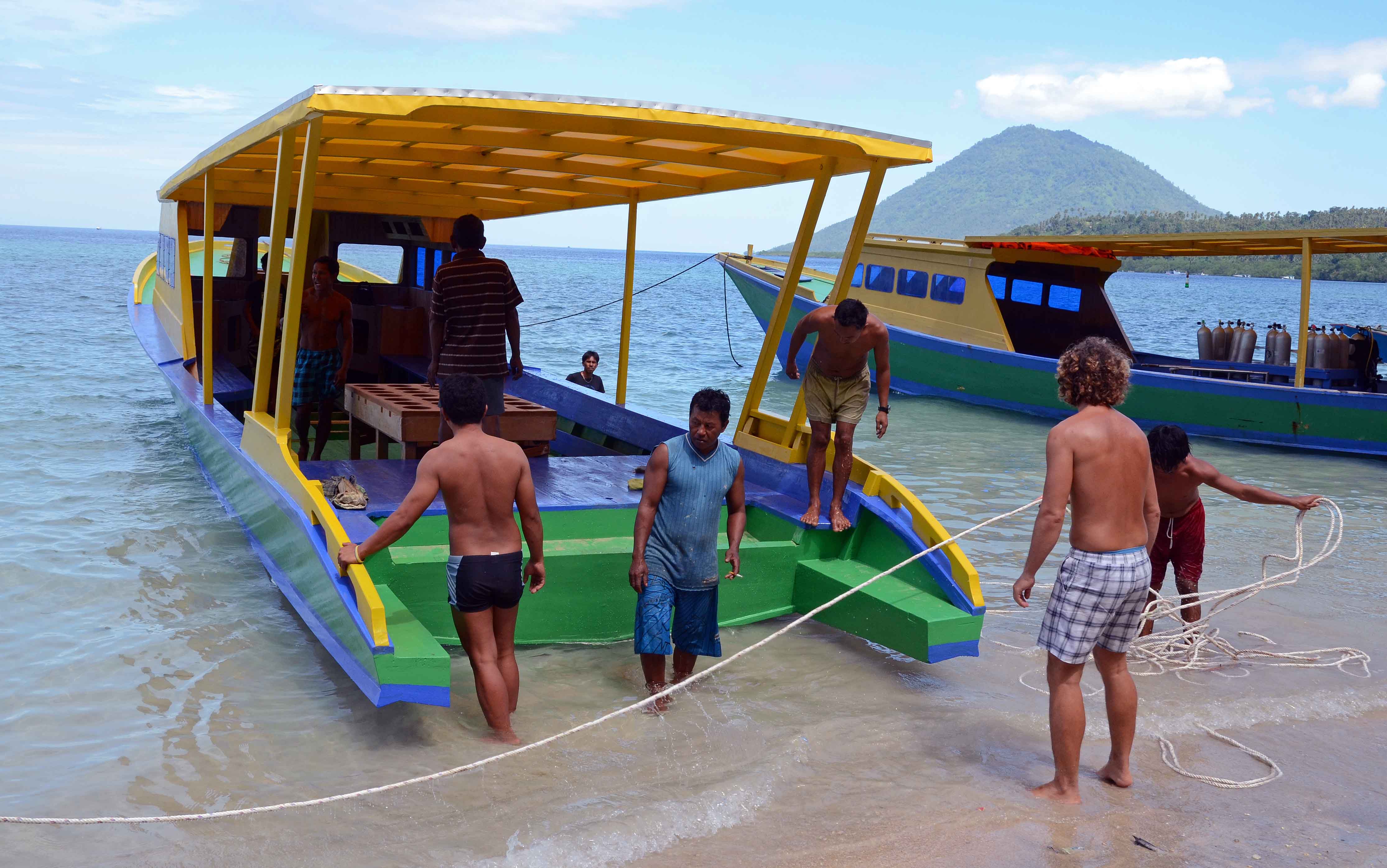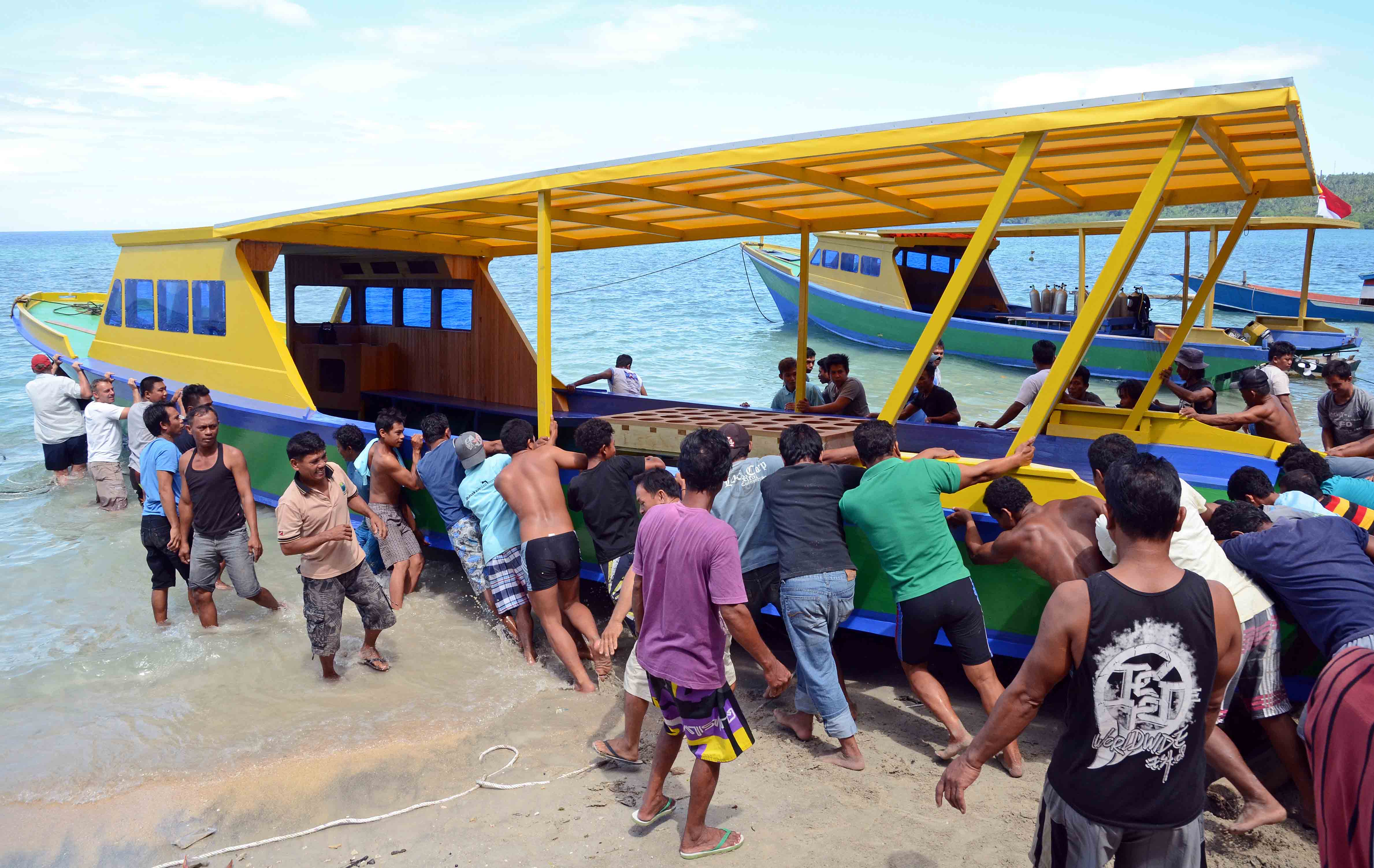 When I was staying on Bunaken Island, in North Sulawesi, I saw and photographed the launch of a new dive boat. The boat had been build using traditional methods, just above the beach just below Bunaken Island Resort where I was staying. The boat was to be launched using manpower alone, and so people (men!) had been invited from other resorts and locations around the island to help with the launch. Here are some of the men arriving on another dive boat.
