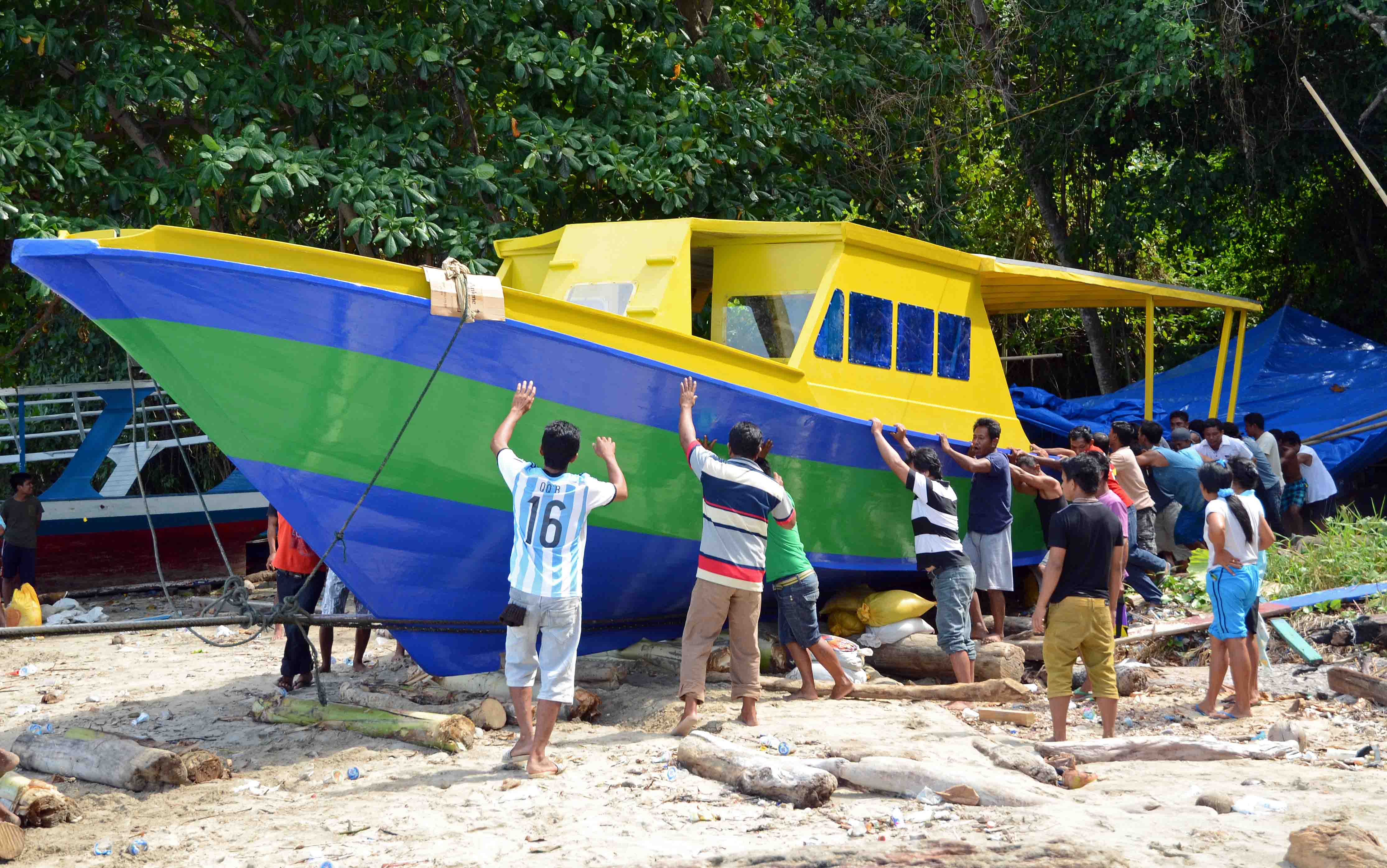 Finally, with a bit more shoving the boat ended up in the sea.