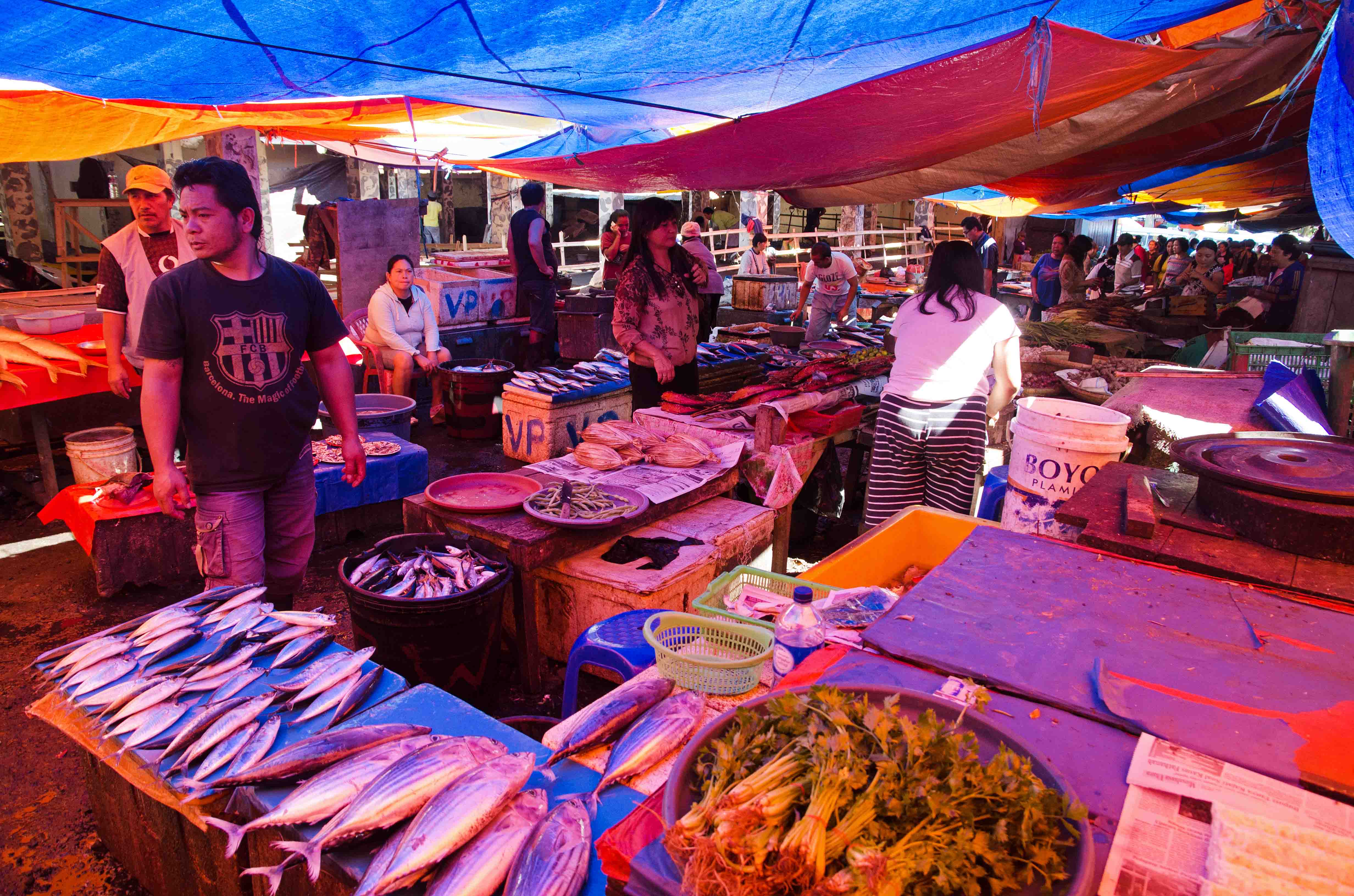 I really like photographs where there is a depth of field – I don’t mean in terms of it all being in focus – but where there is a scene stretching from the foreground into a distant background, as in the above image. I think it is more interesting if the eye can follow through into the image. It is a matter of keeping an eye out for such scenes, but it also needs a bit of luck. I never take enough photographs, they can always be deleted in this digital age, and – as any professional will admit – it is only by trying hard AND taking a lot of images that you get lucky and take a good one. I am not sure how good these are – it is easy to fall in love with your own photos – and one has to be very severe in rejecting all but the best ones. This is another one which runs from front to back, and also has some interesting colours created by the blue, red and orange canopies above the stalls selling fish and vegetables.