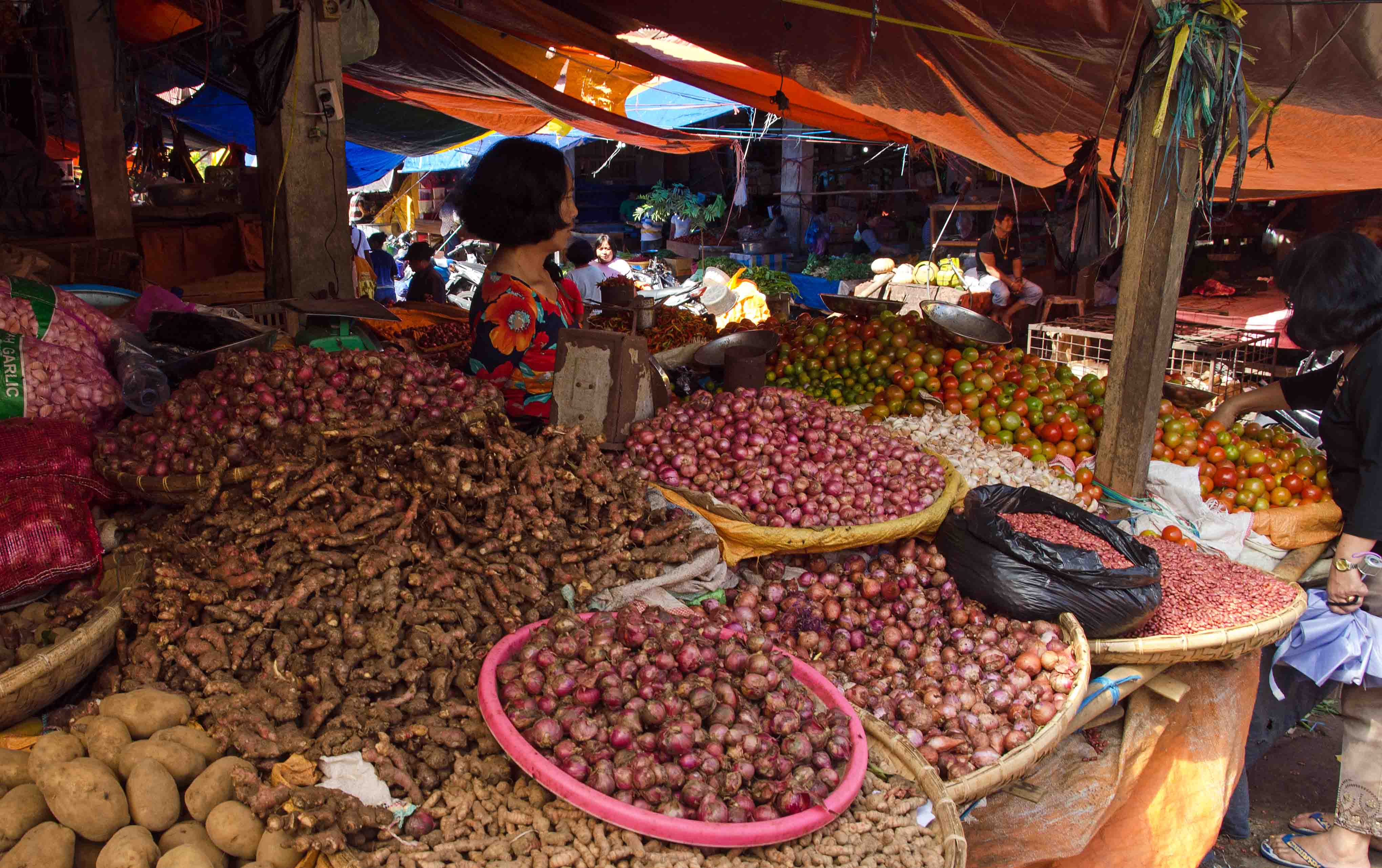 This traditional market in Tomohon is famed for having a lot of local meat, including things which many westerners do not eat such as dogs, rats and bats. I am less concerned about these than I am about threatened (rare) species, but I was not really in the mood to look at them, so I concentrated on trying to get some colourful images (literally) rather than gruesome images of roasted canines!