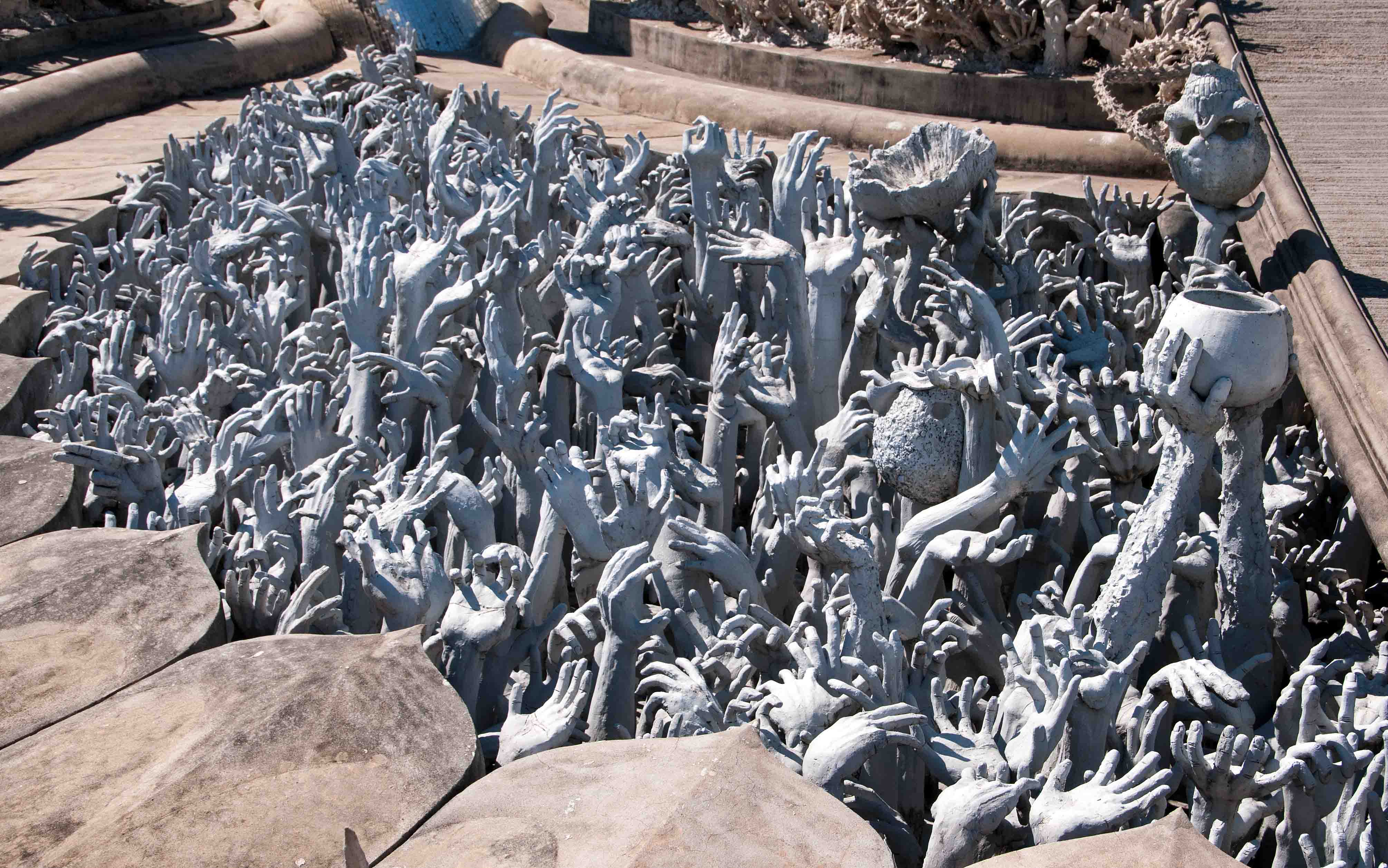At first one crosses the bridge of ‘the cycle of rebirth’ past a pit of outstretched hands. These are presumably humans beings locked into a cycle of continual rebirth as a result of their unrestrained desire for pleasure. The sea of hands was a very potent symbol of human suffering.