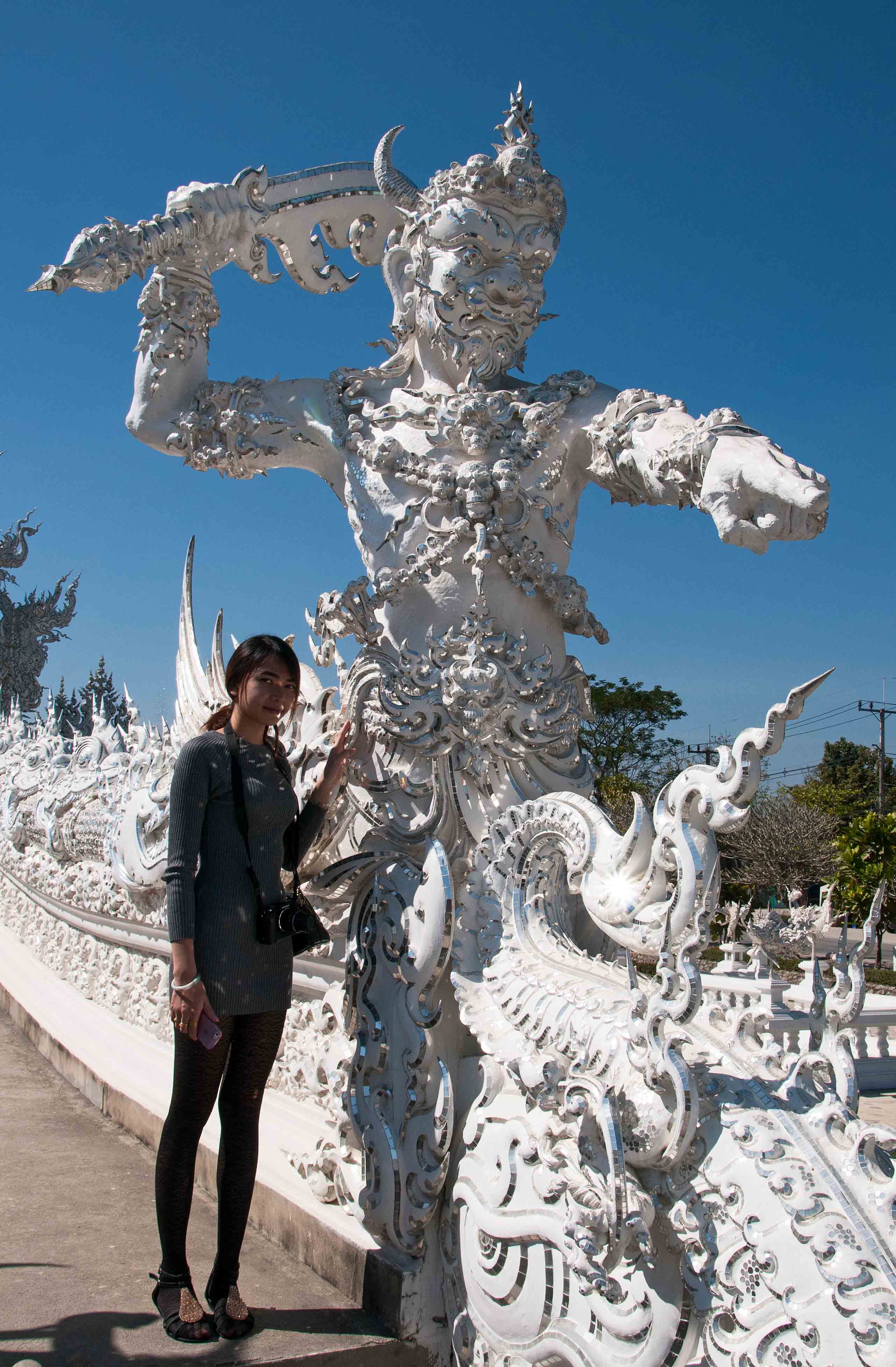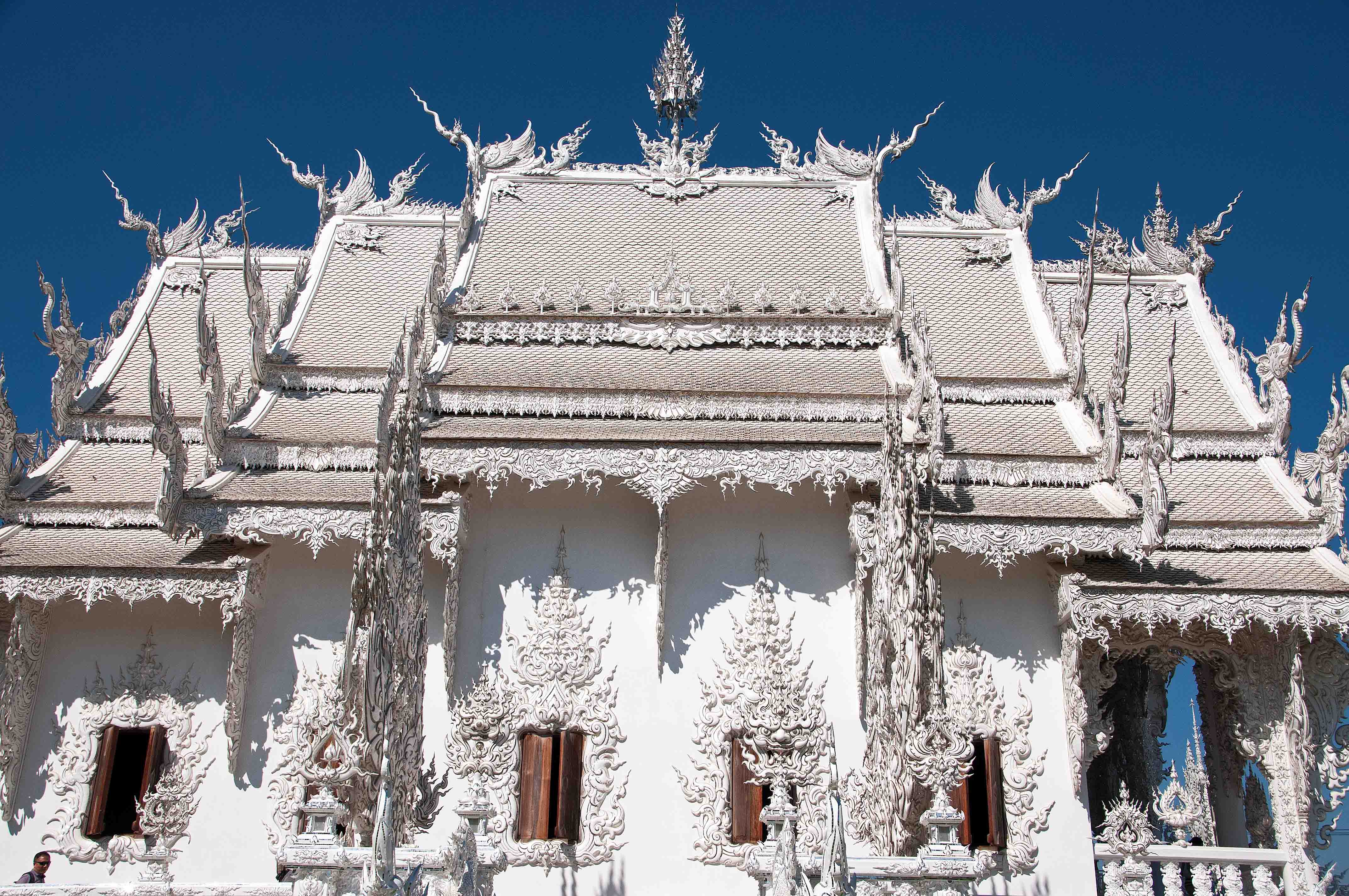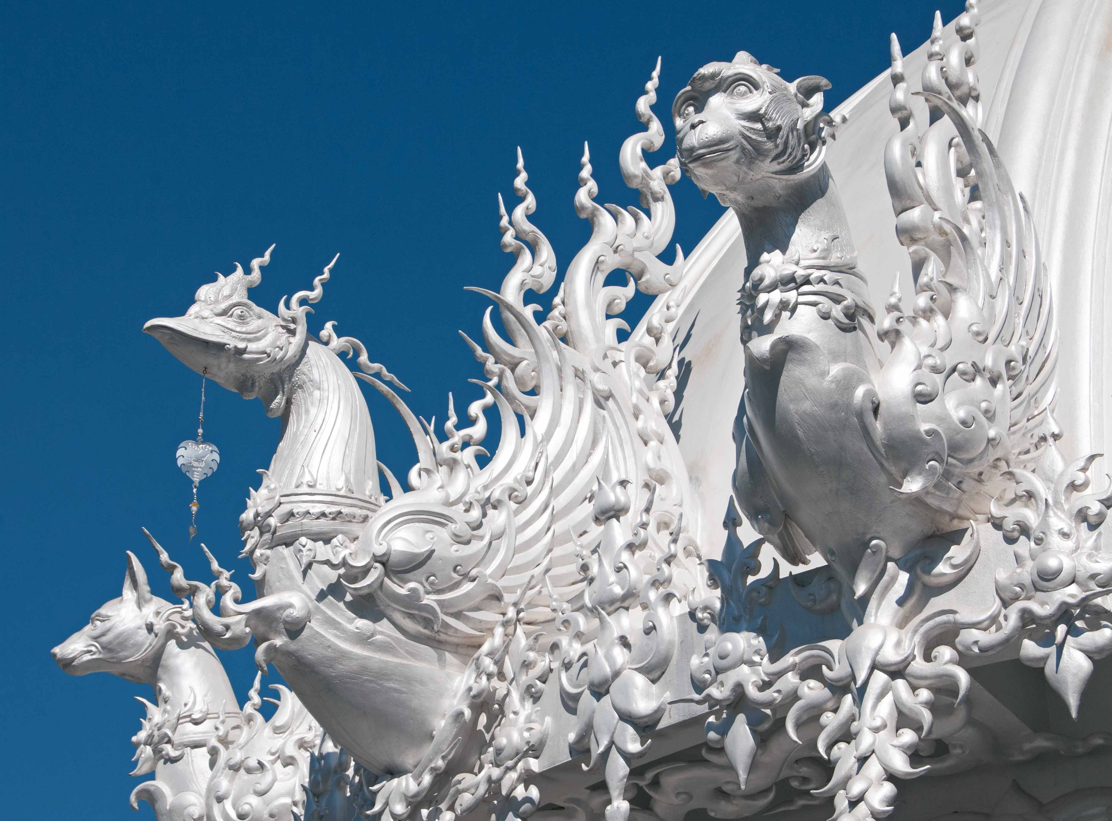 From a distance it looks like a traditional Thai Buddhist temple (Wat), albeit incredibly ornate and all white. On closer inspection, it becomes apparent that this is no ordinary temple, since it contains all sorts of allegorical art works, part art gallery, part religious building.
