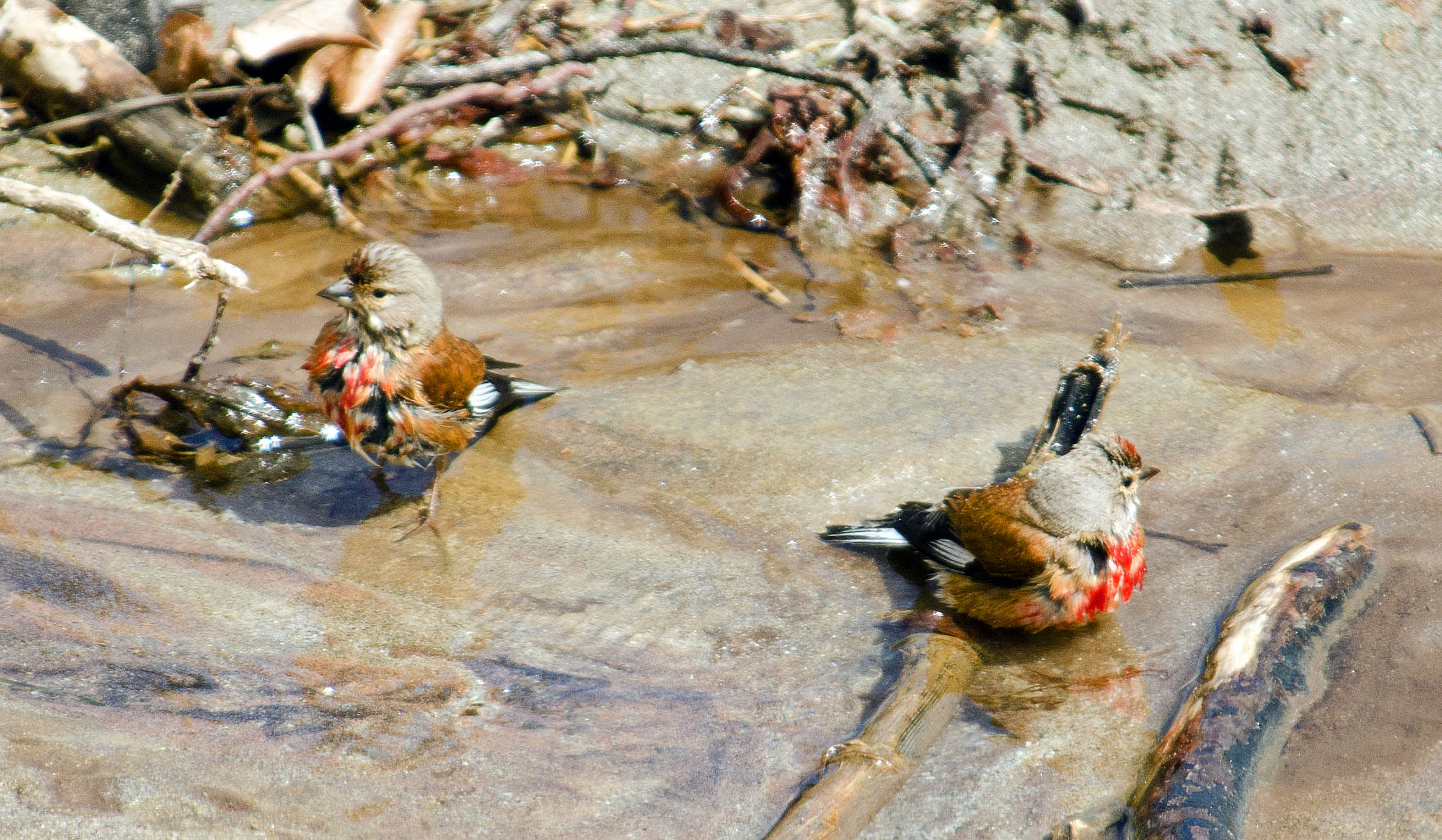 They also seem to like to get water right up under the breast feathers. Who wouldn’t! The two males in the following photo appear to have lifted up their breast feathers and you can see black under the red and white feathers. Must be wearing a vest!