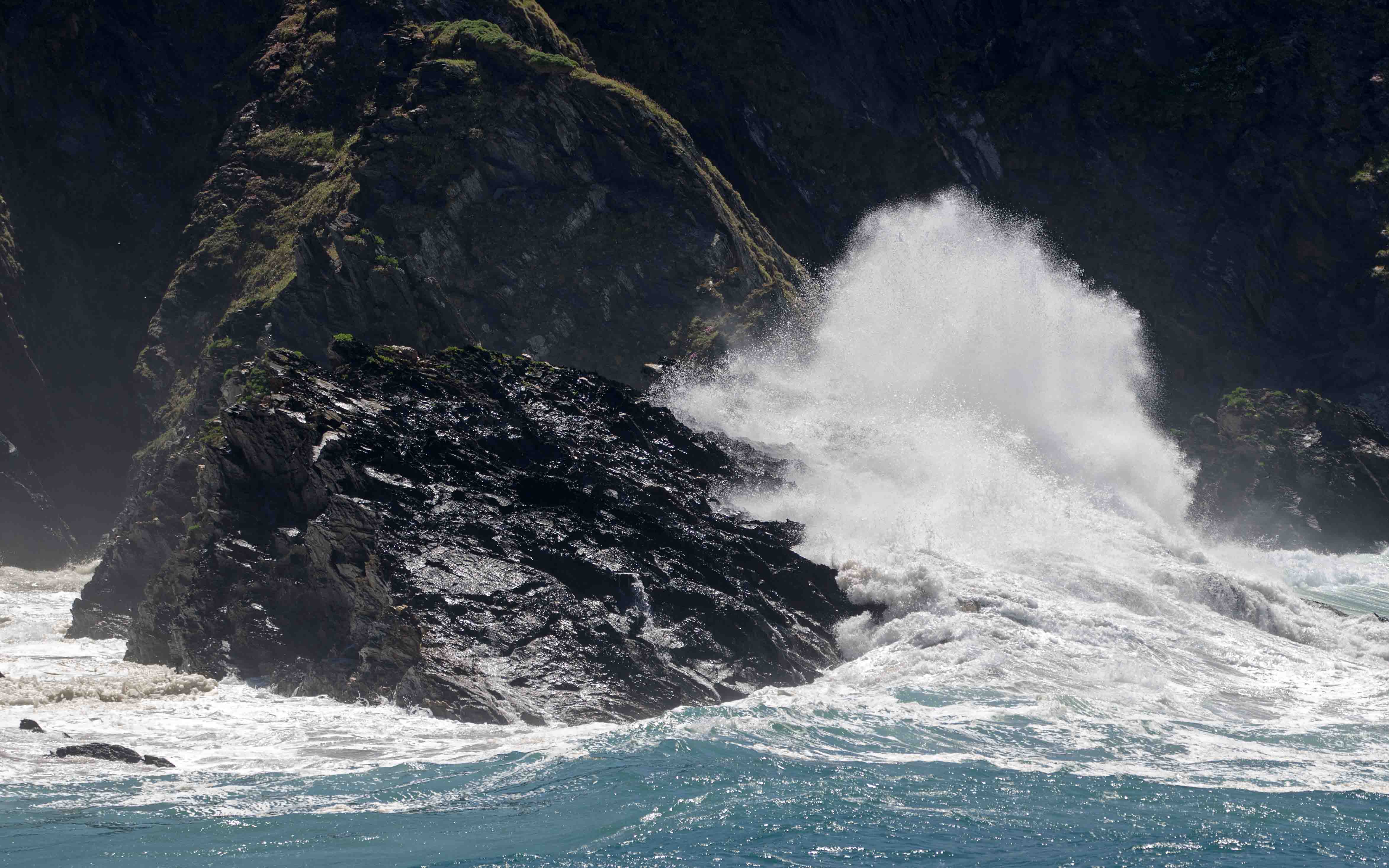 The waves were crashing into the rocks on this day in early June. The spray rose high into the air and the water cascaded down the rocks back into the ocean. Few surfers were braving the elements on this day in early June. I stood on one side of the bay and pointed my lens at the waves breaking on the other side, trying to catch some of the power and dynamism of the ocean. On Esterio beach, Galicia, Spain.