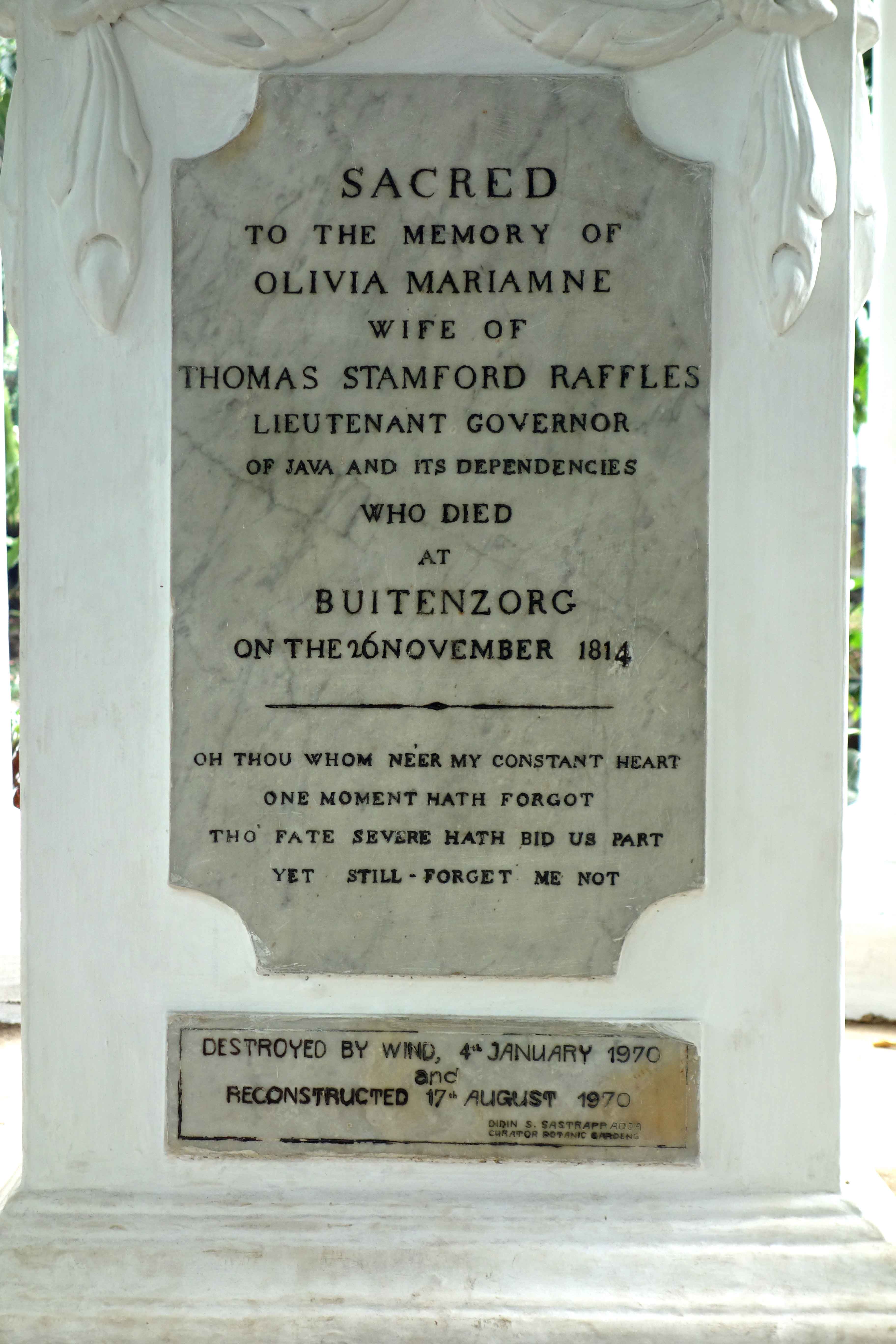 Olivia Raffles (Née Olivia Mariamne Devenish) died of malaria in Bogor, on 26 November 1814. A rather tragic irony, given that the Botanical Gardens subsequently played major role in the introduction of Cinchona trees (in 1854), which went on to make Java the largest producer of quinine bark for the treatment of malaria.