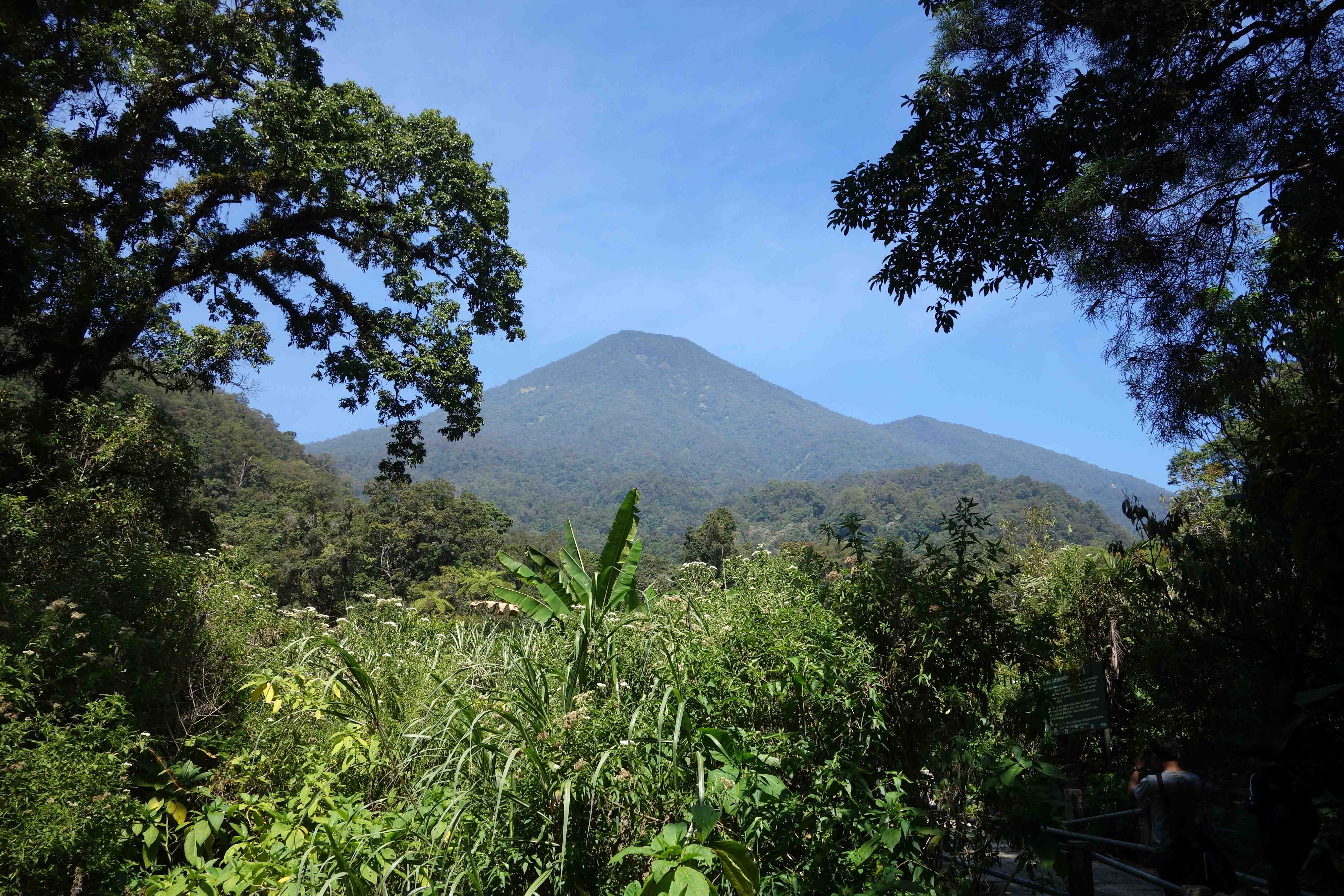 Alas, I never made it to the Hot Springs/Air Panas (2,150 m) and turned around at about 2,000m, to save my knees. There is much to see beyond this point, and Wallace describes in detail the flora on the higher slopes of the volcano, much of which was of a temperate kind, familiar to him from his botanising in England. So I would like to go back, not only to see the impressive volcano itself, but the birds, insects and plants to be found on the top of these mountains. Like many climbers today, Wallace camped near the top and took time to explore both peaks. I had to be content with a view of Mount Pangrango from the trail on the way down (below).
