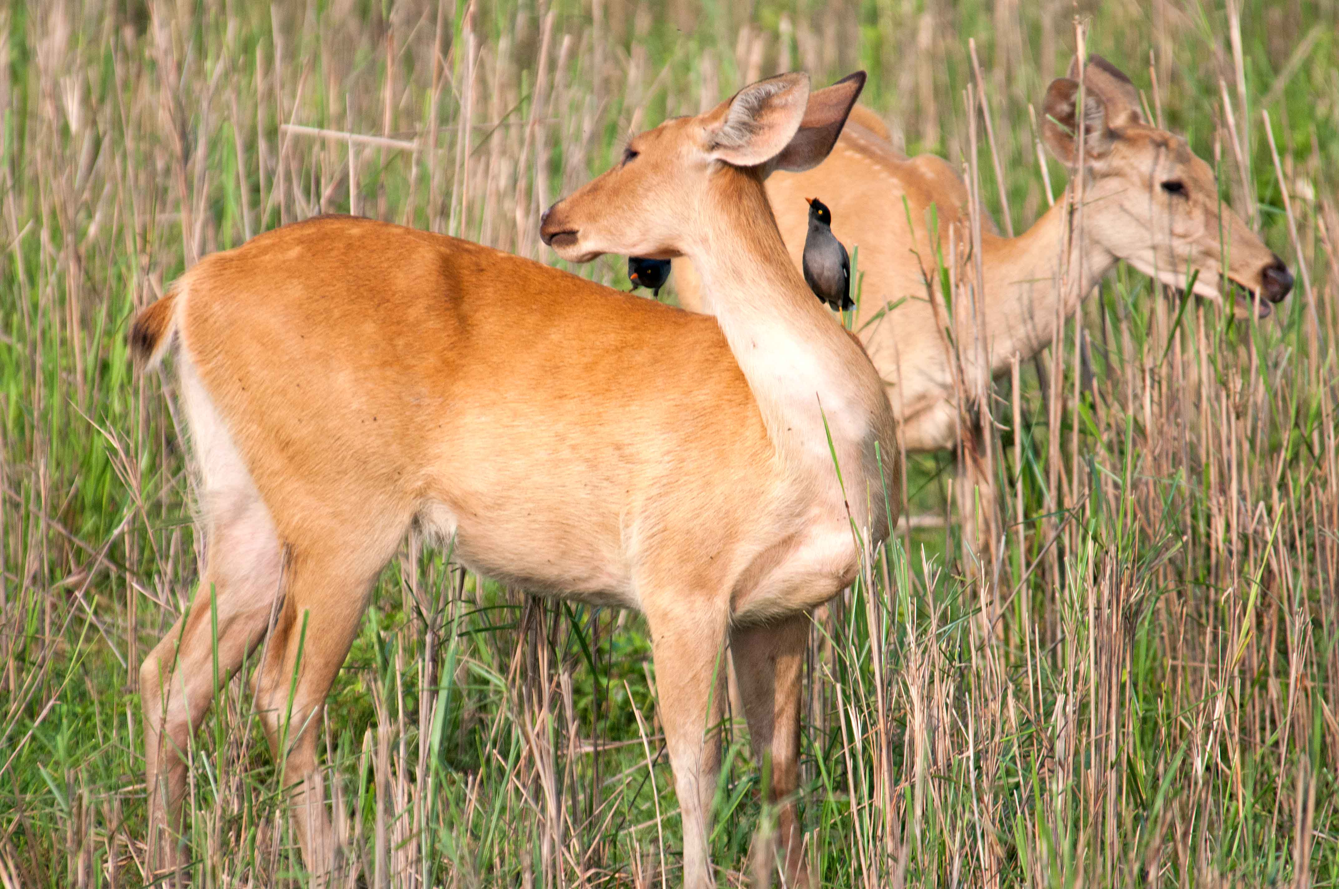 The jungle mynas also provide a tick-pecking service to the deer as well as the buffaloes!