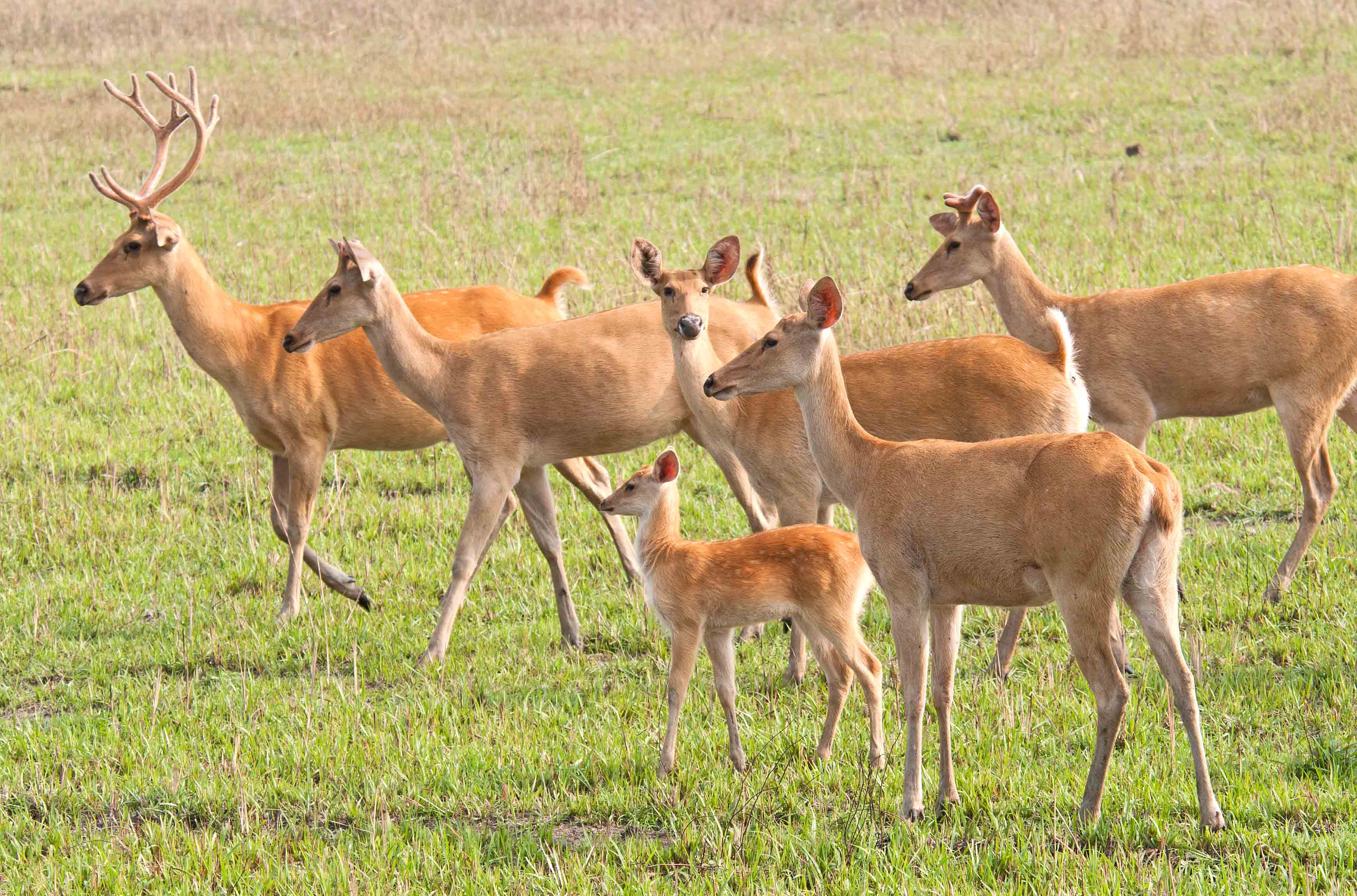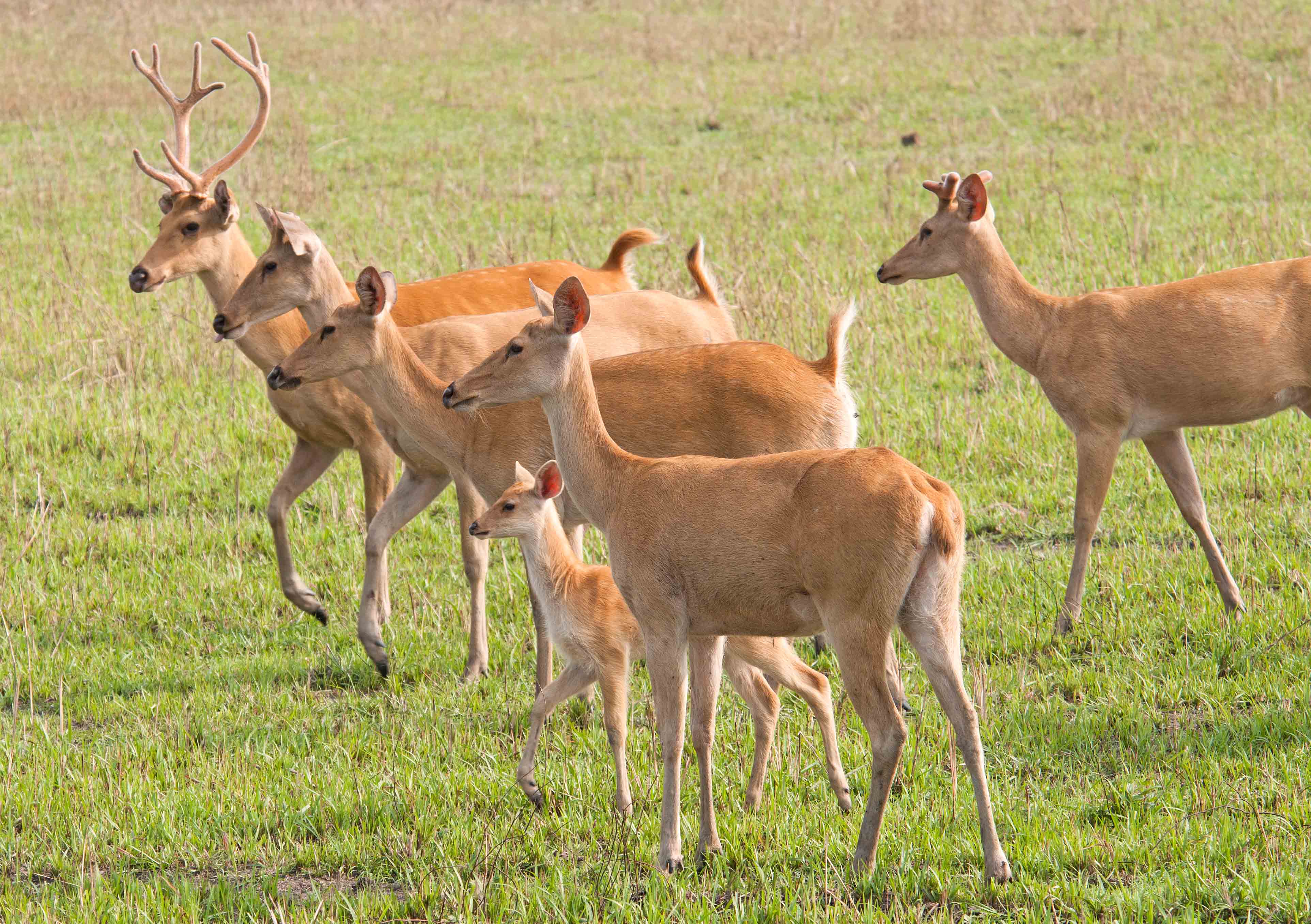 There are three subspecies of this lovely deer in India, and the ones present in Kaziranga NP are Eastern swamp deer, R. d. ranjitsinhi (Grooves 1982), of which there are reportedly about 700 present. The females are smaller than the males – stags can weigh up to 280 kg (below) – and the young deer are spotted (see above).