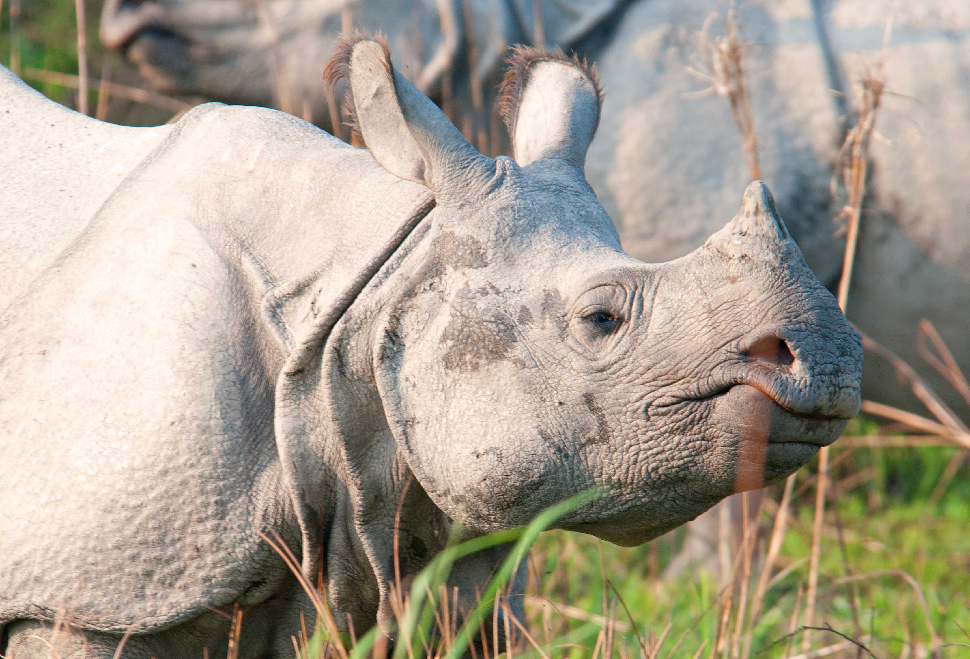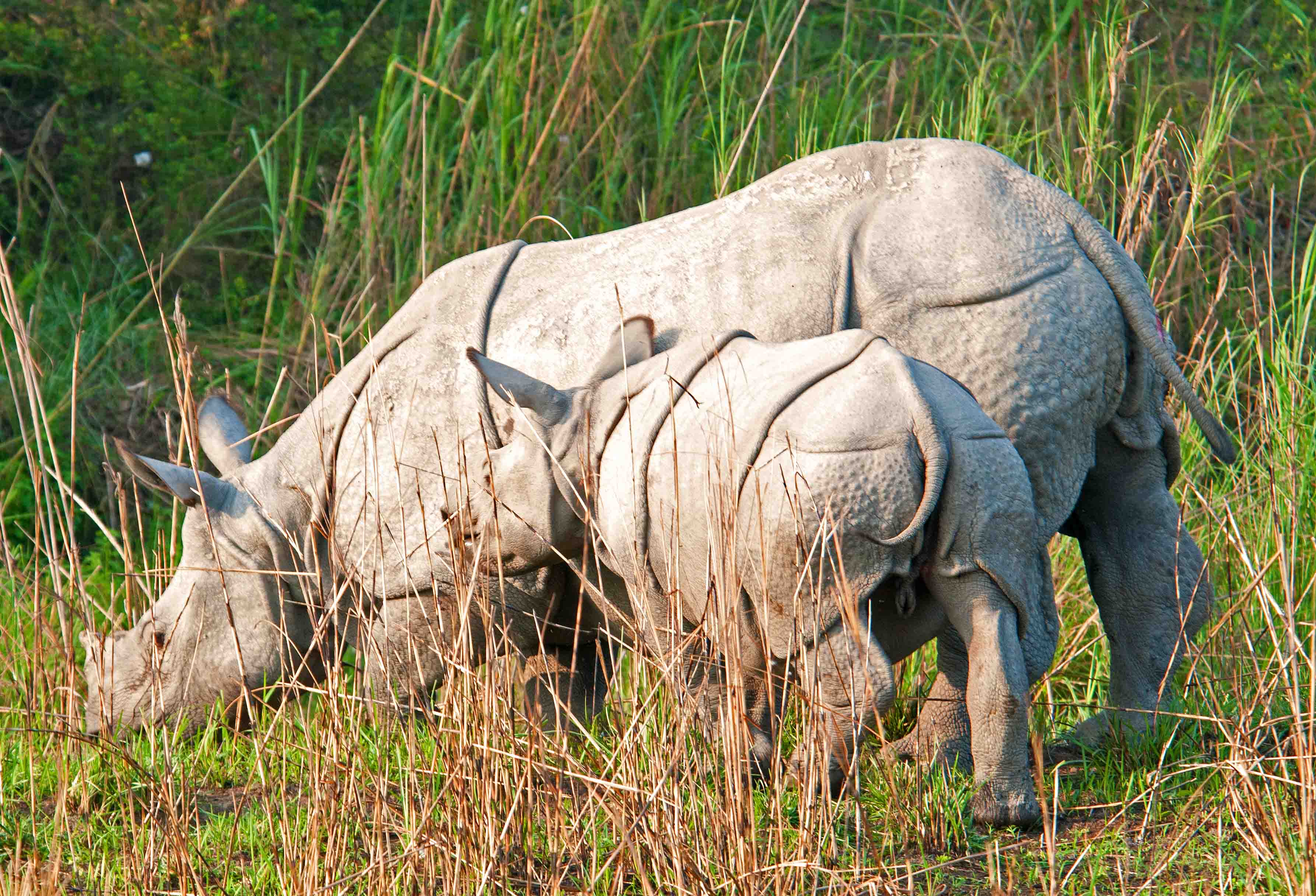 Kaziranga National Park covers an area of 430 sq kms along the southern bank of the river Brahmaputra, in the province of Assam, in NE India. The park is famous for having the largest remaining population of the Great Indian one horned rhinoceros (Rhinoceros unicornis). These magnificent mammals are amongst the largest rhinos in the world, with some males weighing up to 2.7 tonnes (ref 1).