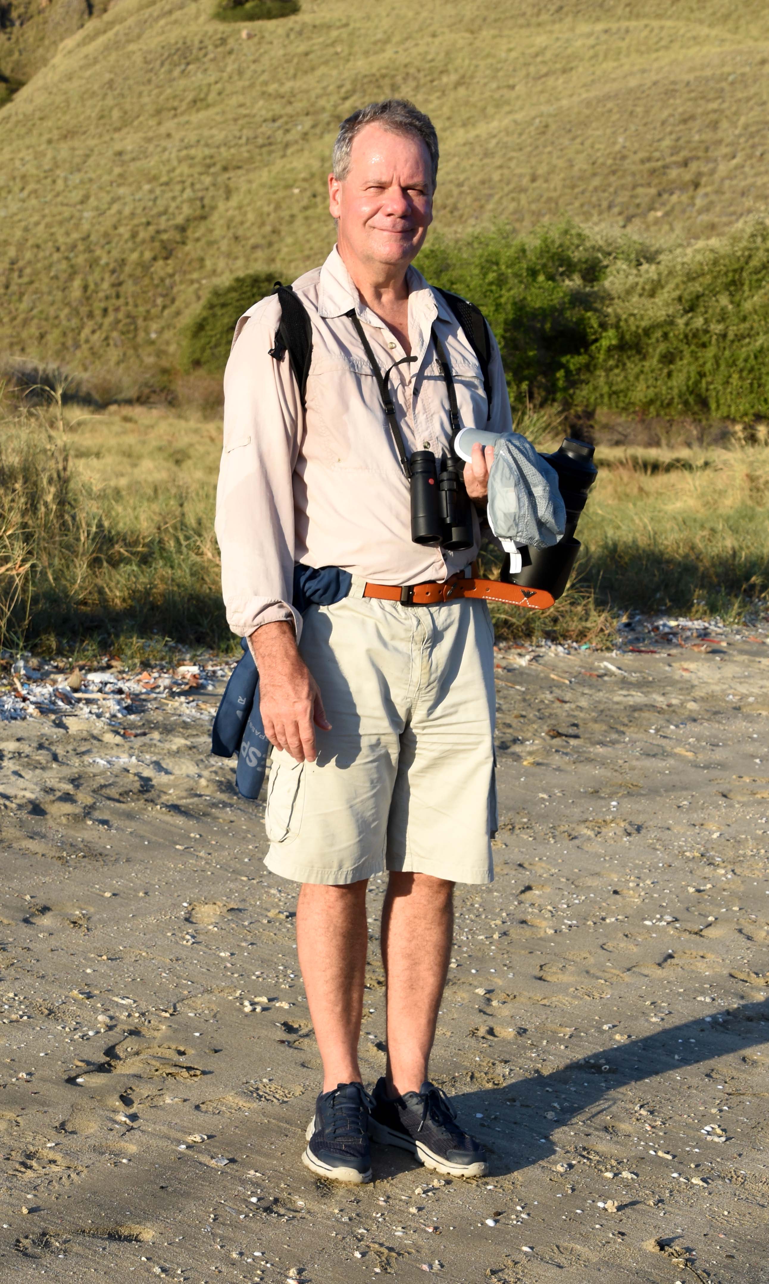 I would recommend a visit to Komodo NP. It is a world-famous location but was not over-run by tourists and from what I could see, the Indonesians seemed to be doing a good job of protecting and managing it. I’ll finish with a photograph of myself, looking hot but contented after a spell of bird-watching.