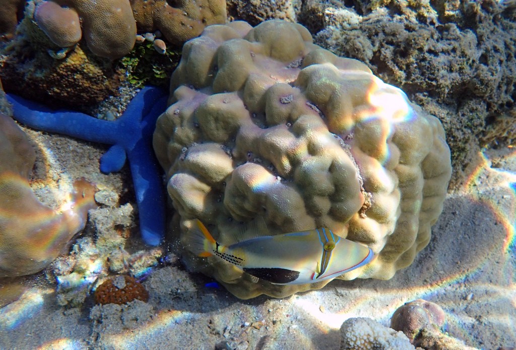 The water was relatively shallow, so it was quite straightforward to swim down and photograph the more interesting inhabitants of the reef, like this gorgeous blue starfish.