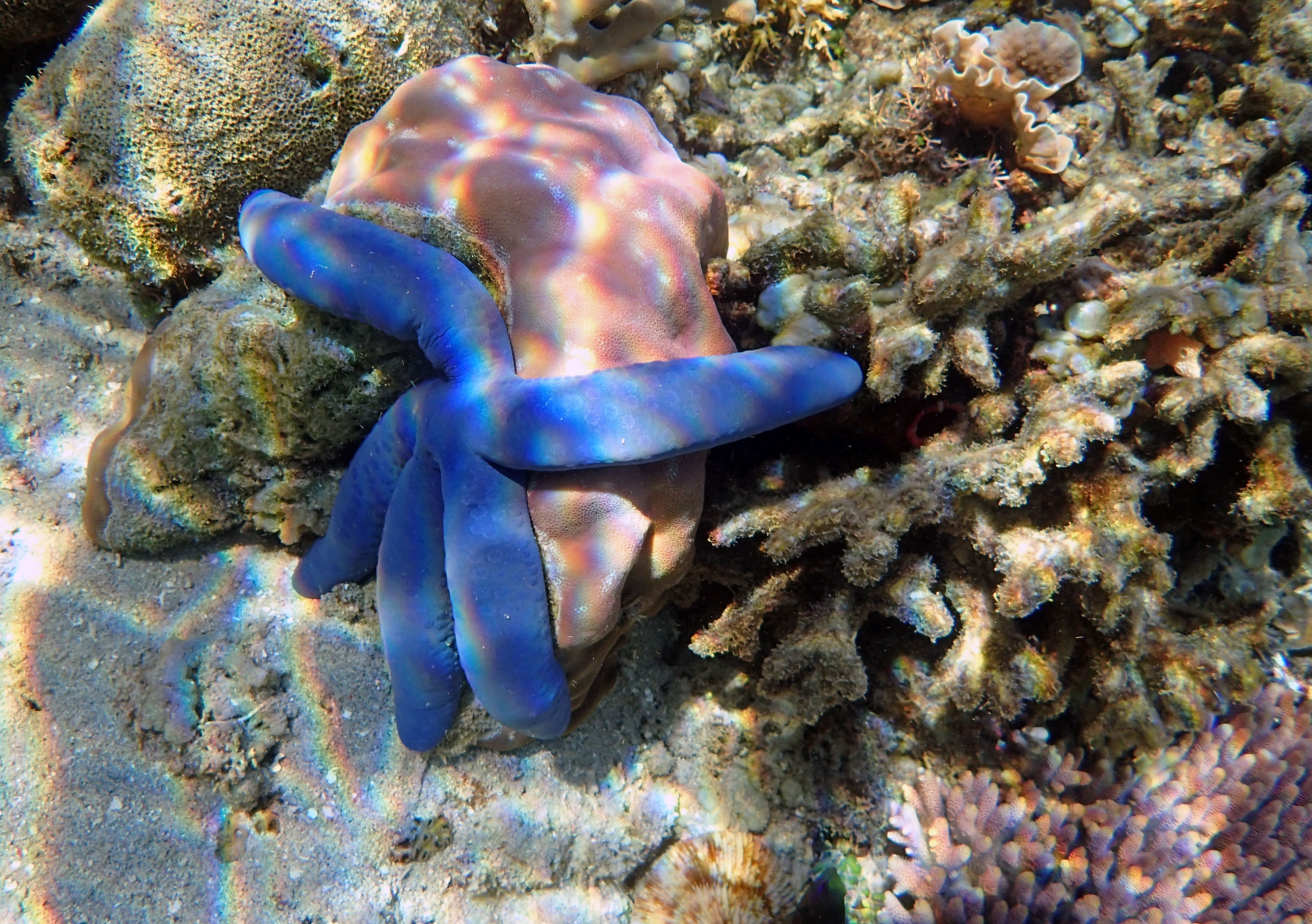 The water was relatively shallow, so it was quite straightforward to swim down and photograph the more interesting inhabitants of the reef, like this gorgeous blue starfish.
