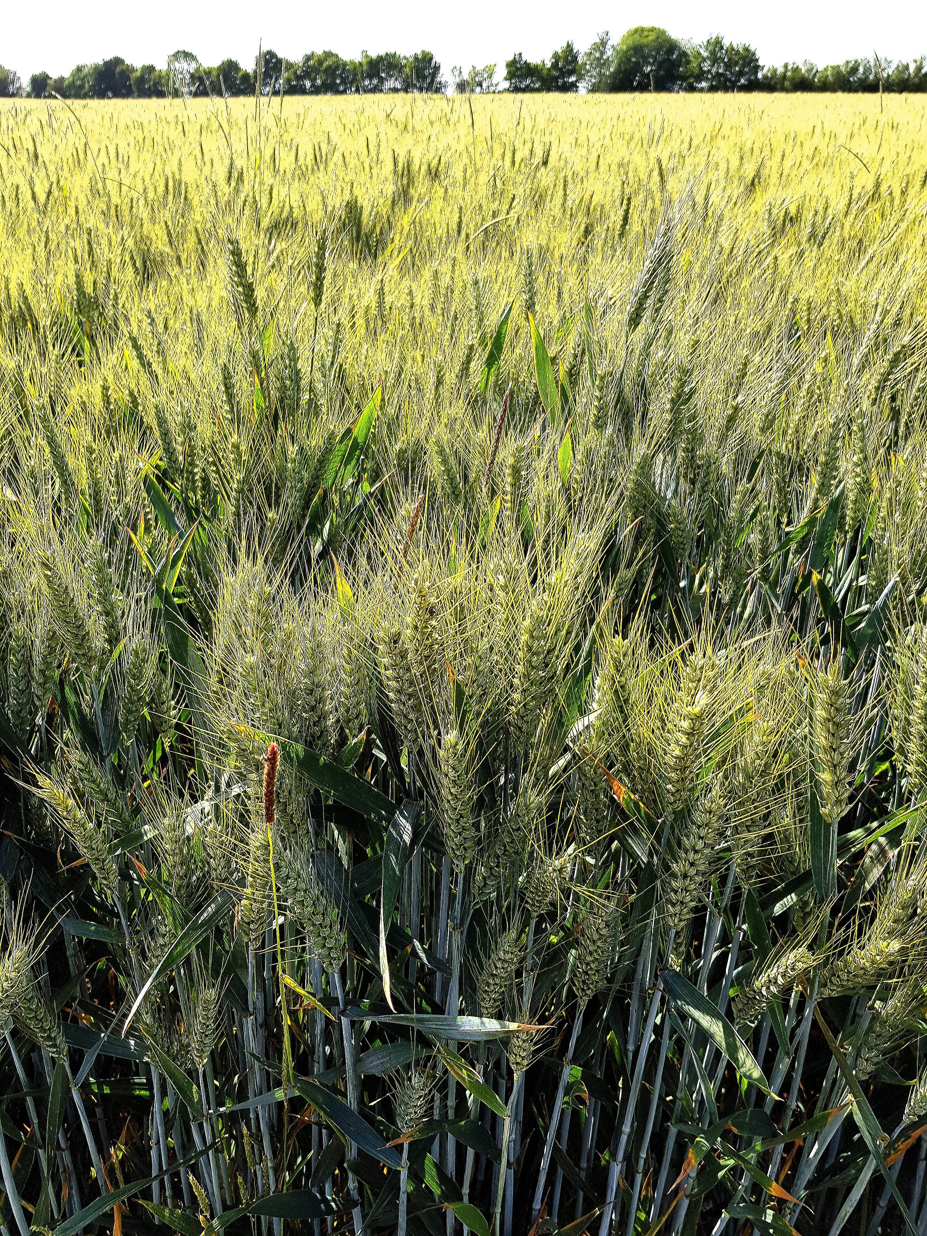 Wheat – most of which is winter wheat (planted in the autumn) – is a classic monoculture; a single crop stretching out to the horizon (below). Farmers get about 8 tonnes per hectare on average, resulting in a total British harvest of somewhere between 15 to 17 millions tonnes. That sounds good, but we are a fairly small producer on a world scale, although the EU as a whole is the largest producer (just above China).