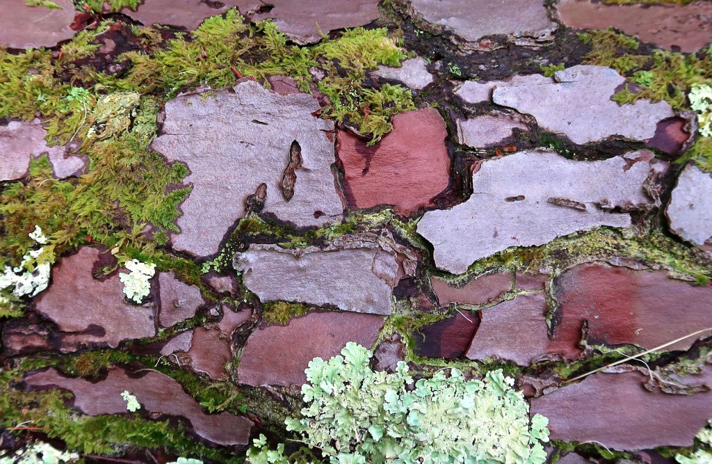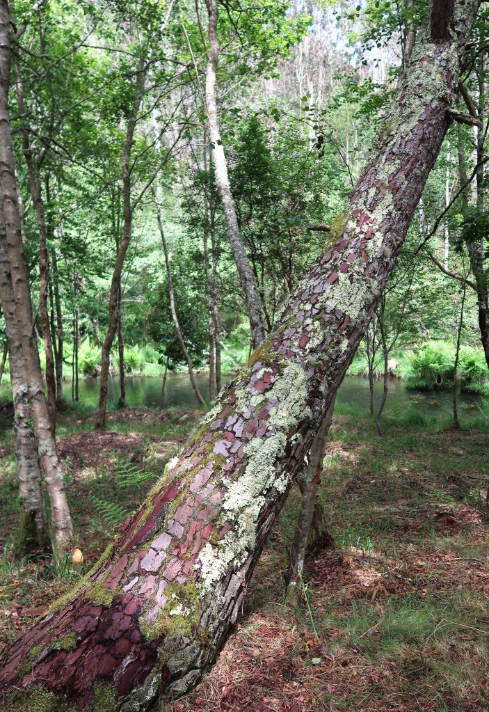A came across this amazing tree earlier this year in Galicia, Spain. It was partially prostrate, but still growing. The beautiful, plate-like bark was adorned with mosses and lichens, which gave it a strangely artistic effect, almost like an abstract painting! It is, I think, the stone pine (Pinus pinea L.).