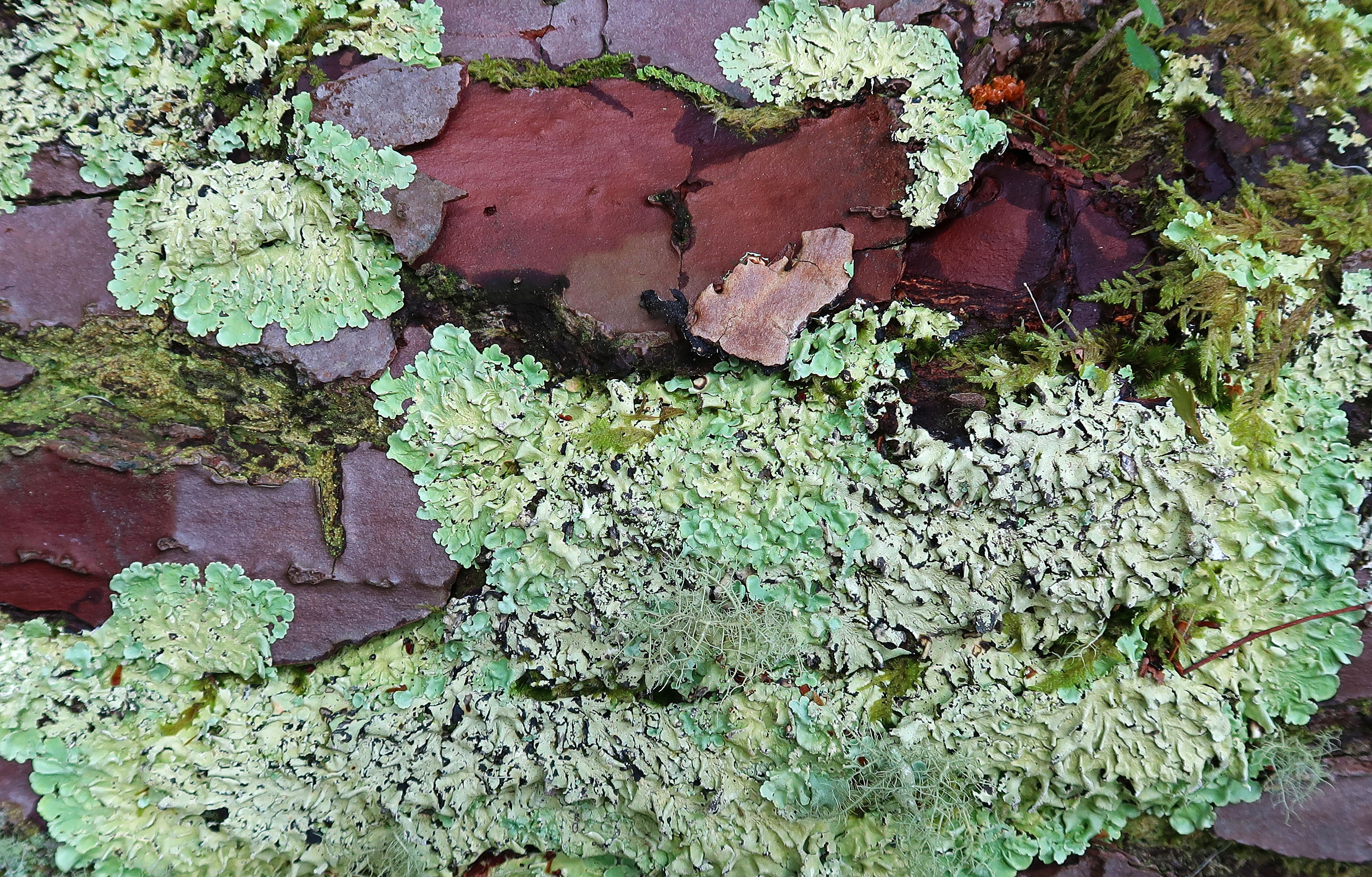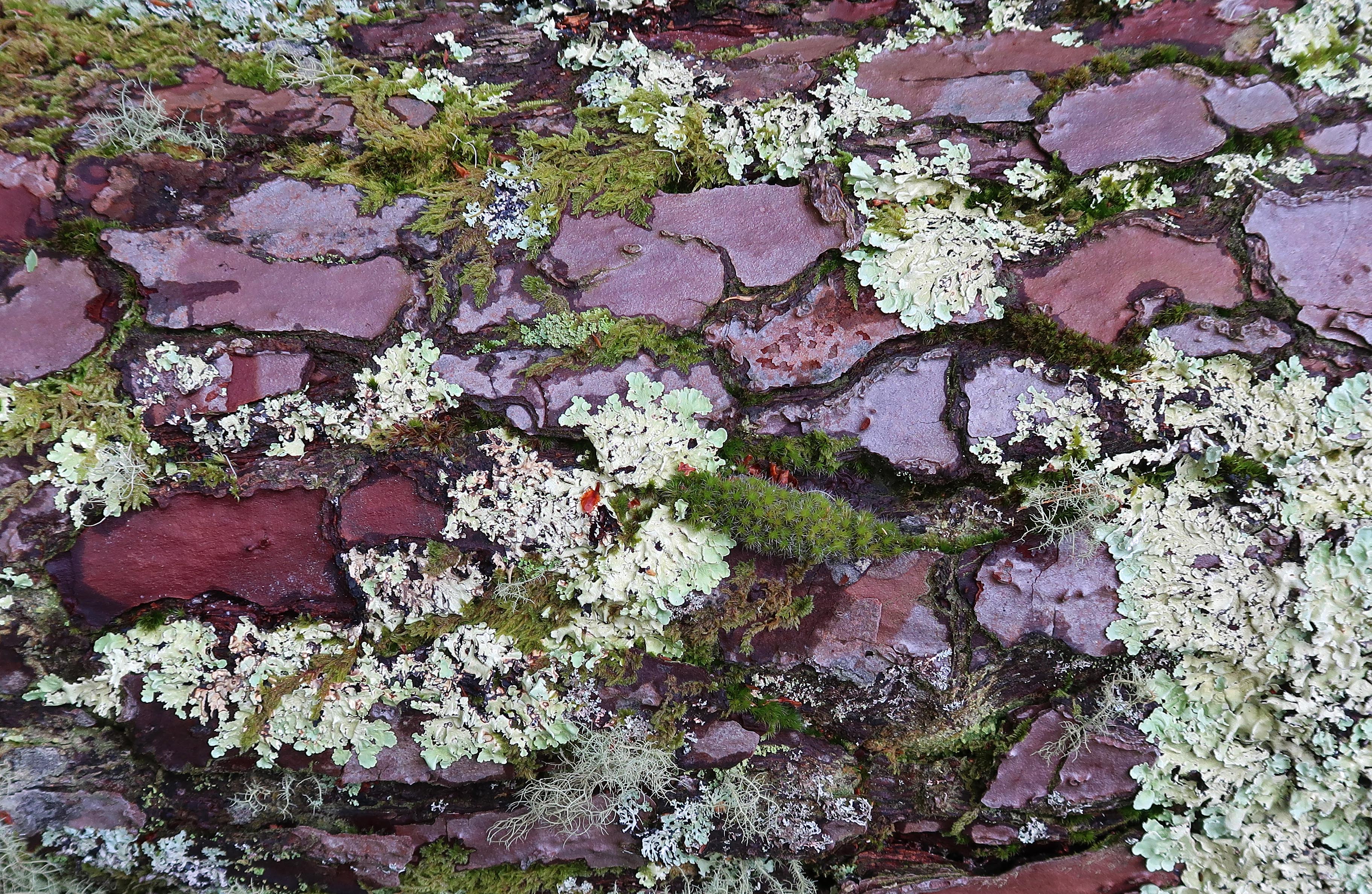 A came across this amazing tree earlier this year in Galicia, Spain. It was partially prostrate, but still growing. The beautiful, plate-like bark was adorned with mosses and lichens, which gave it a strangely artistic effect, almost like an abstract painting! It is, I think, the stone pine (Pinus pinea L.).