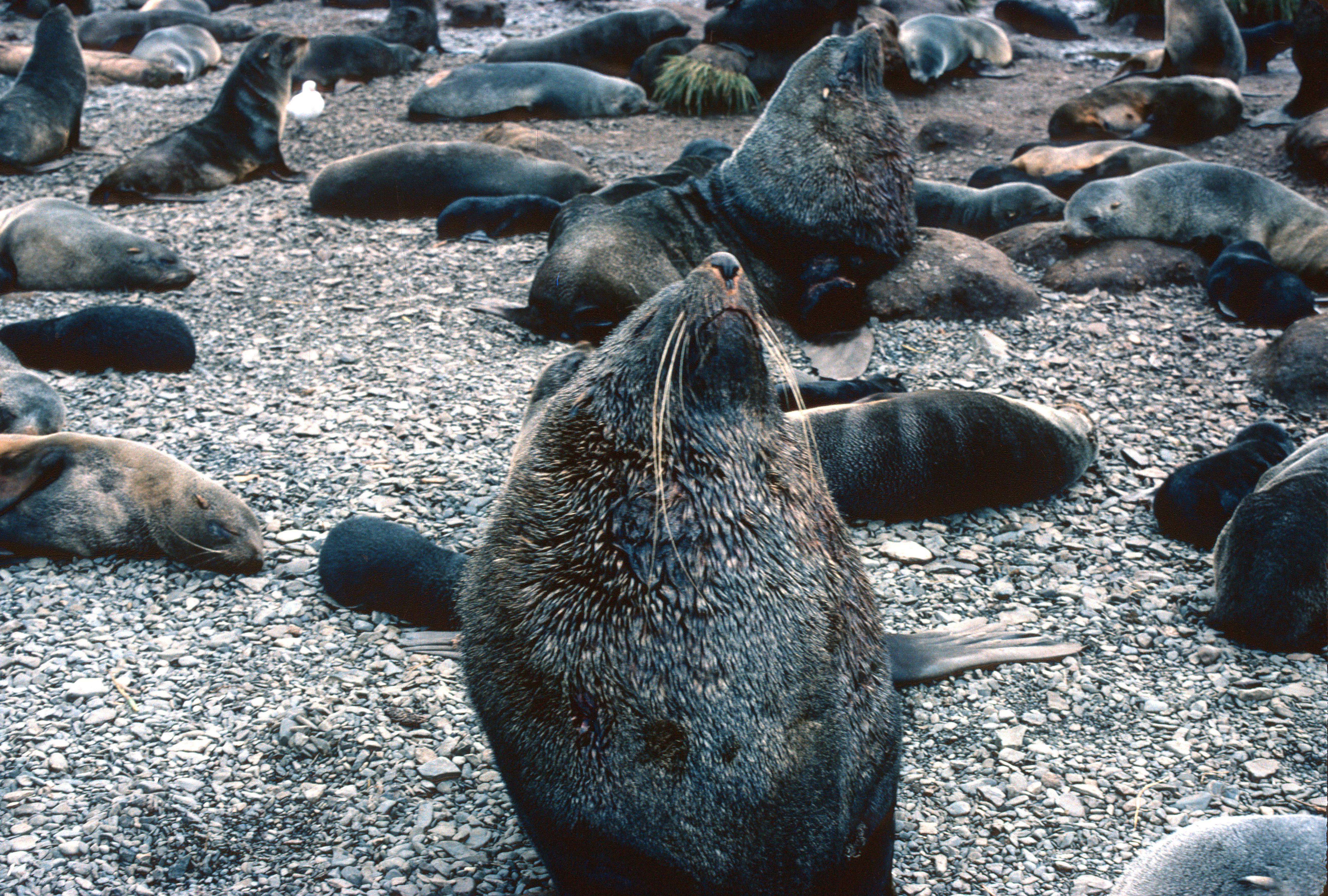 Because we were walking through a breeding colony of Antarctic fur seals, the large, territorial males had to be temporarily walled off behind a row of oil drums, to dissuade them from sinking their teeth into our thighs!