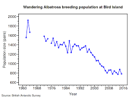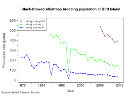 Unfortunately, the Black-browed albatross population on Bird Island has been in a long-term decline in breeding numbers since the mid-1970s (see graph below). It shows how numbers of birds have declined markedly since I visited in 1982.