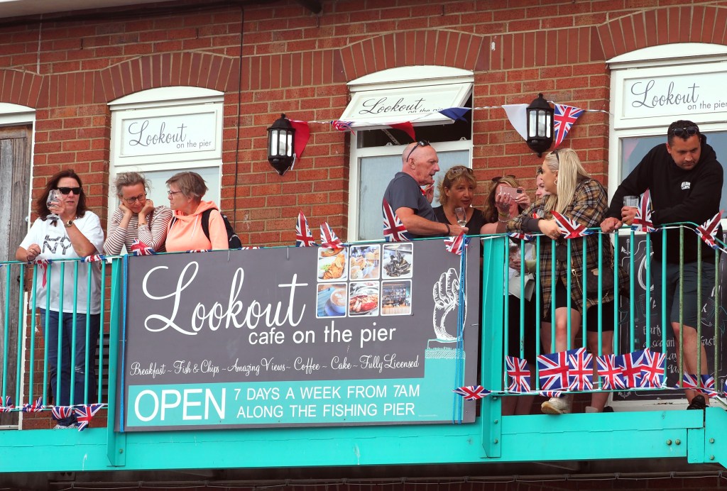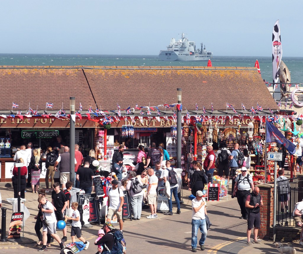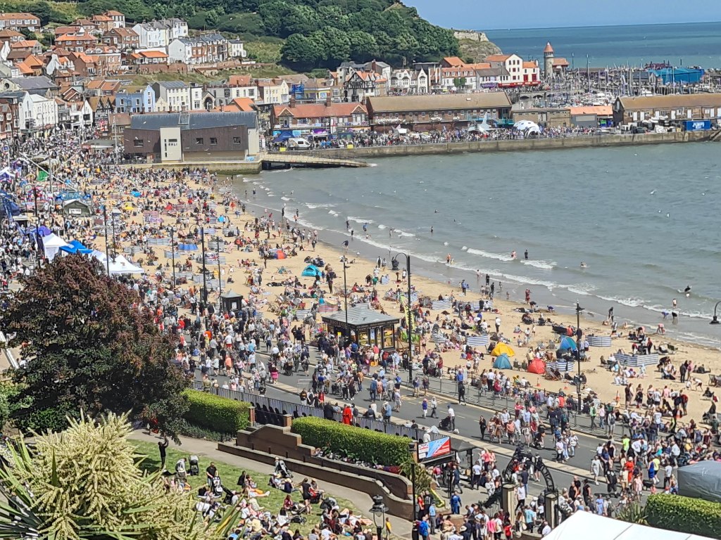 Crowded South Bay Beach Scarborough 25 July 2022HMS Westminster anchored offshoreMarking upTalking aimReloadTyphoon displayTyphoon displayTyphoon displayUpside downFlying the flagWatching the air displayAttentive poochBorder force dogArmy No. 1’s I think