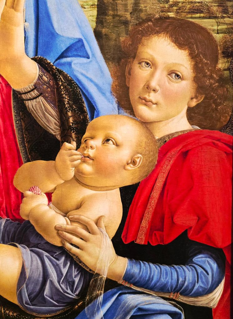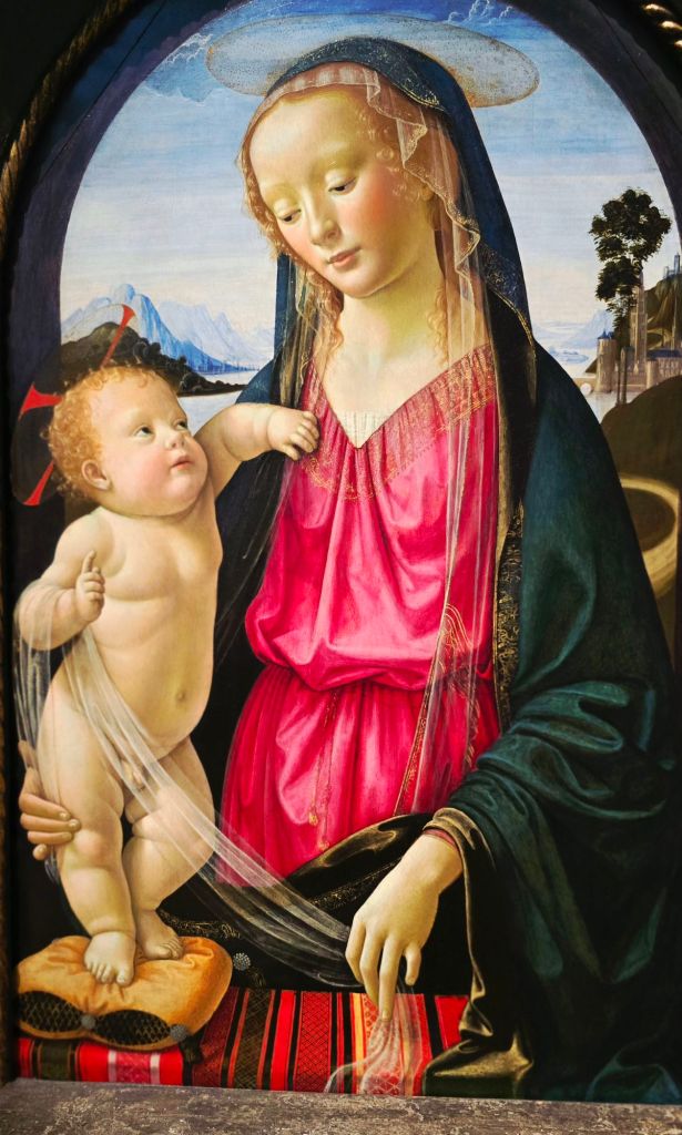 Once again, the details are incredible. His student Lorenzo di Credi painted the chubby Christ Child, the parted curtains, and the angel on the right